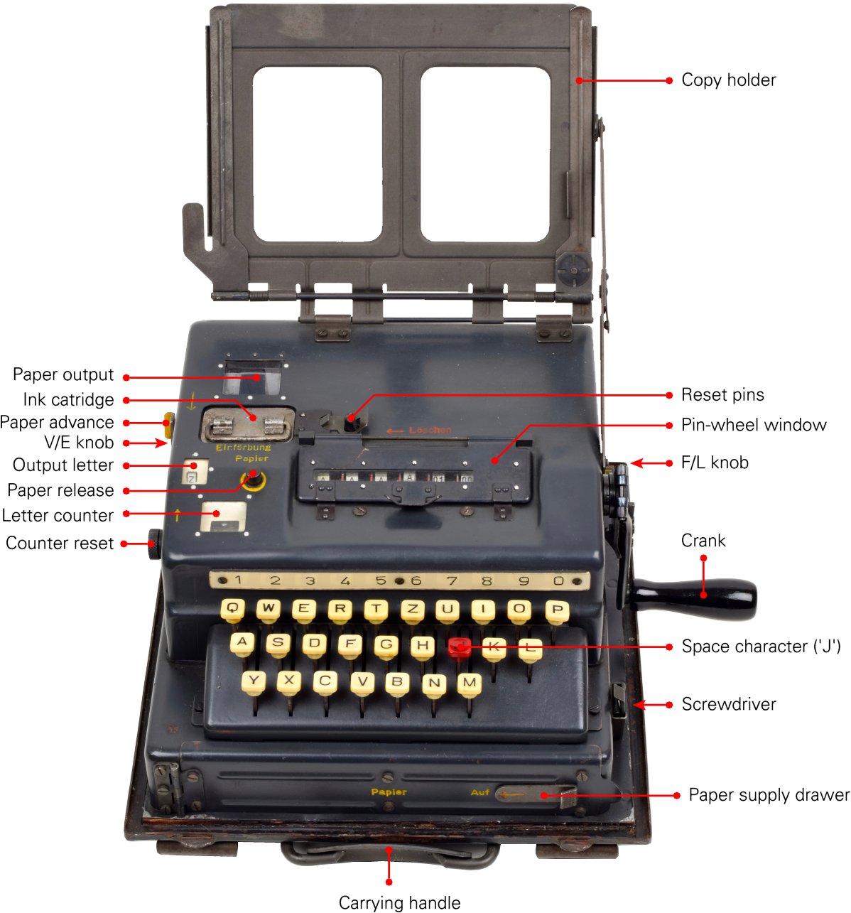 SG-41曾被视为著名的Enigma密码机的继任者。因其侧面配有手动摇柄,该设备在当时获得了“希特勒磨坊”的绰号。它的核心功能是将明文和密文同时打印在两条纸带上。